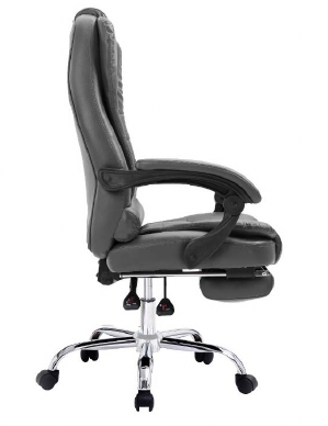 A premium leatherette office chair with a reclining backrest, extendable footrest, padded armrests, and chrome base. Designed for maximum comfort and professional style.