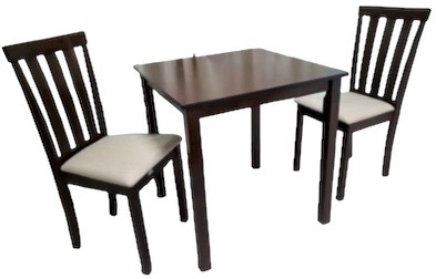 Compact 2-seater dining set designed for condos and cozy nooks. Includes one square table and two matching chairs. Choose between cushioned seats or classic wooden seats.