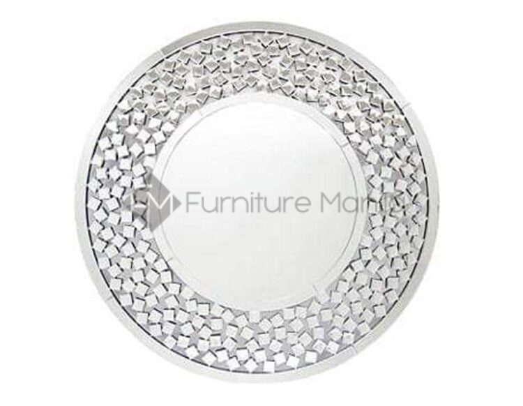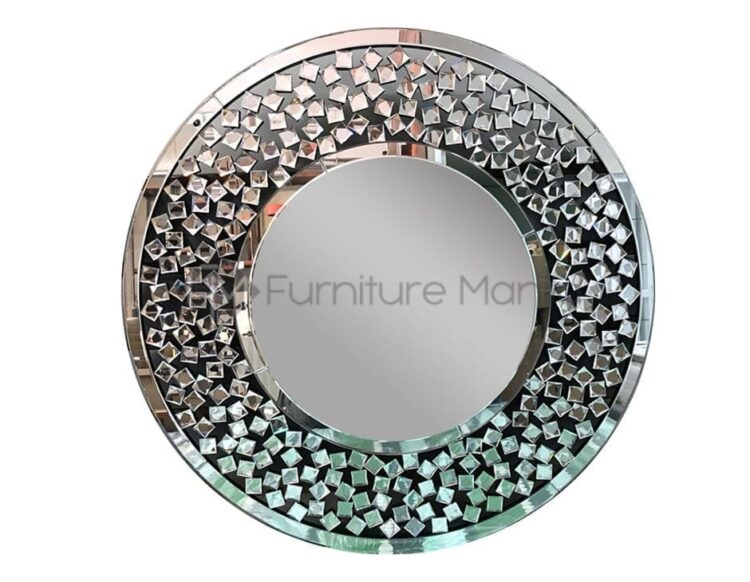 A stunning circular mirror with a beveled mosaic border, perfect for adding light and luxury to any space.