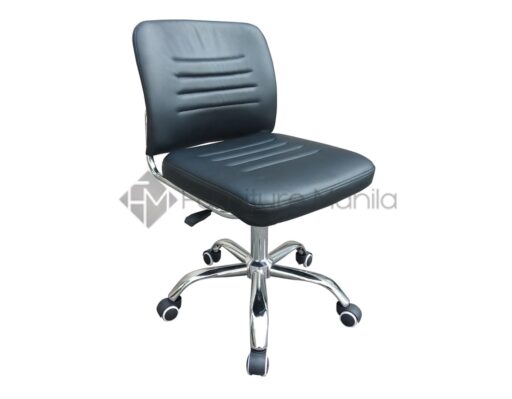 Staff chair without armrest, adjustable gaslift, PU Black back and seat, and chrome finish starbase with castor wheels.
