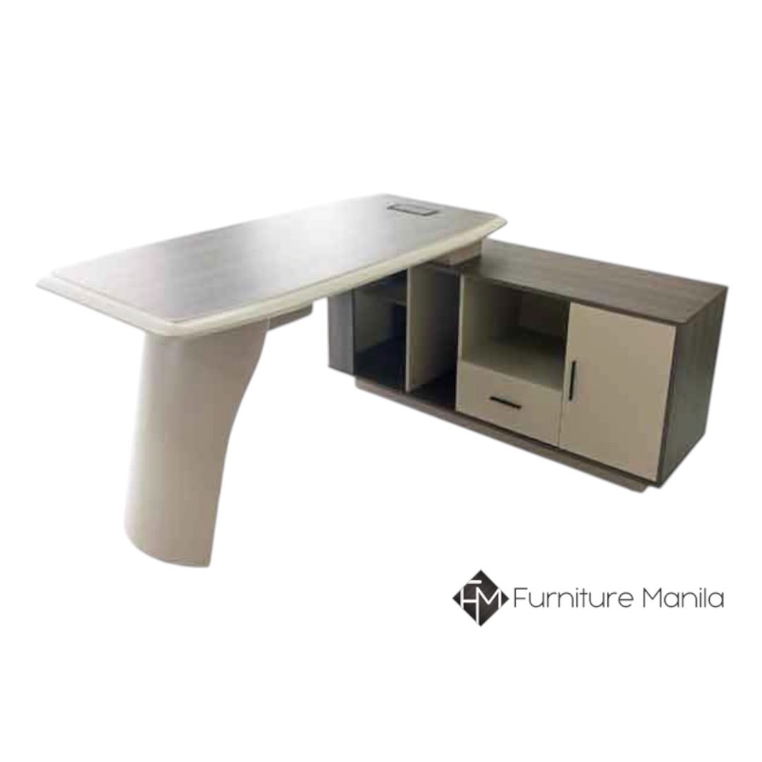 A modern L-type executive table with a sleek curved-leg silhouette, integrated drawer and shelf, and elegant top-edge finish. Available in two sizes: 1.6m and 1.8m.