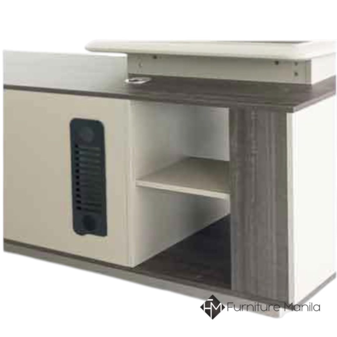 Elevate your workspace with the Atria L-Type Executive Desk, a statement piece that merges contemporary design with practical functionality. Designed with premium MDF laminated boards, this L-type executive desk features curved side legs for a soft architectural look, a stylish top-edge profile, and a side cabinet with drawer and shelf for ample storage.