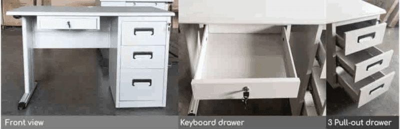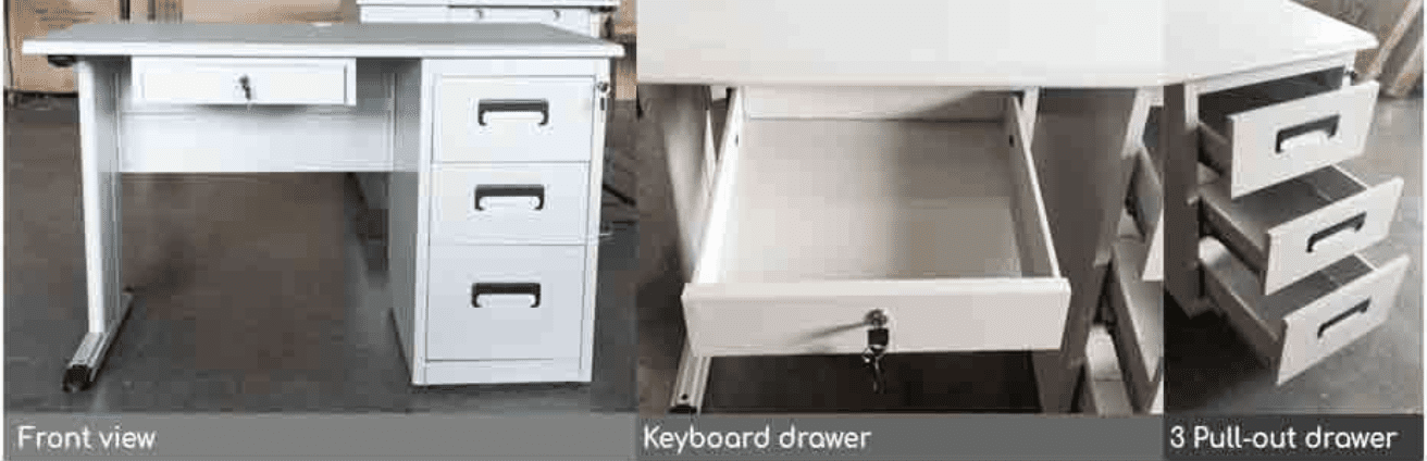 A compact and secure office table with 3 pull-out drawers, a sliding keyboard tray, and sturdy metal legs — perfect for work-from-home setups or office use.