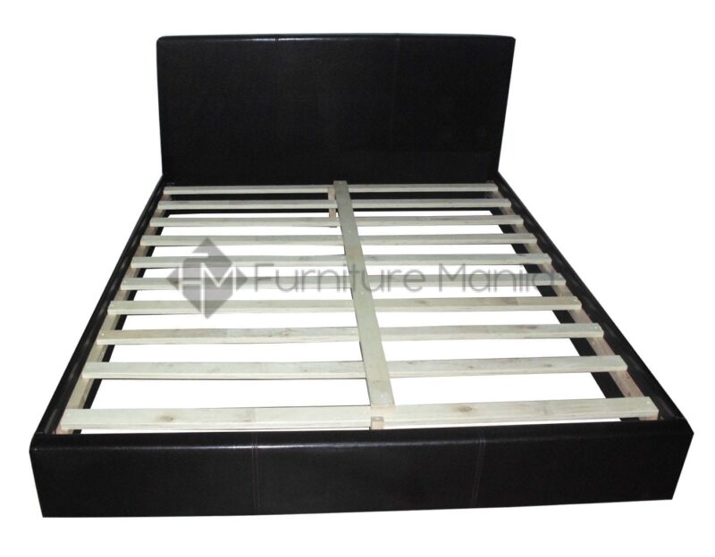 Your bedroom will take on a contemporary look when you add this bed frame to your space. This bed frame is made with Asian hardwood and upholstered with a faux leather wrap and is finished off with a baseball stitching for a bold statement.