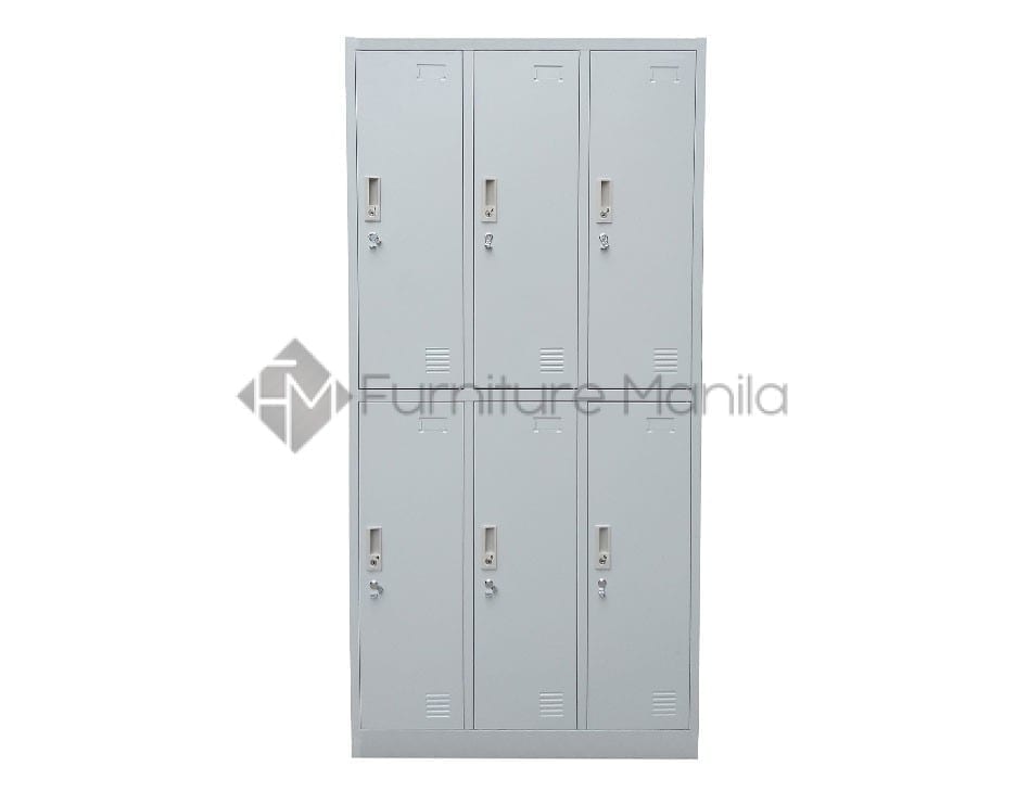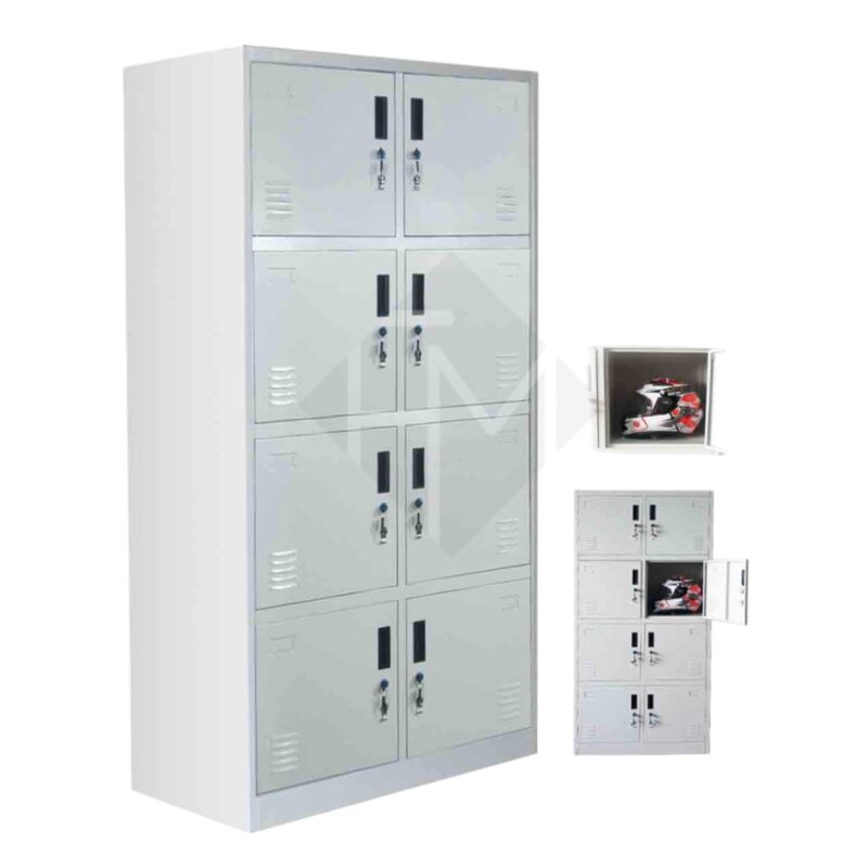 - Material: Metal, Powder-coated in light gray finish, with hasp provision for padlock and built-in locking mechanism