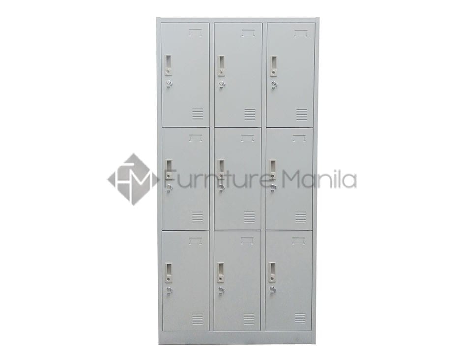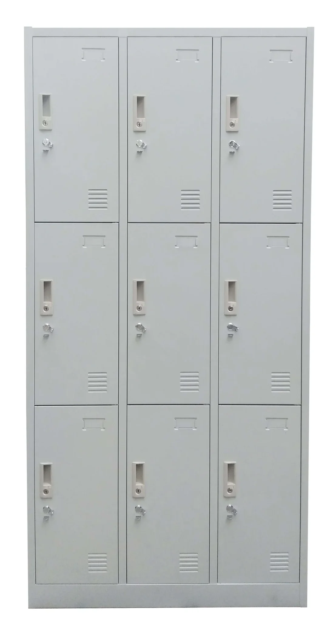 - Material: Metal, Powder-coated in light gray finish, with hasp provision for padlock and built-in locking mechanism