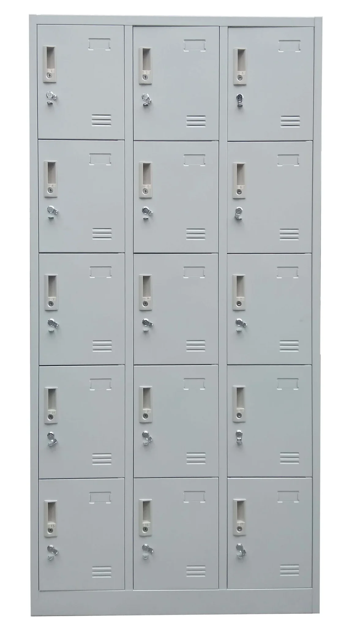 - Material: Metal, Powder-coated in light gray finish, with hasp provision for padlock and built-in locking mechanism