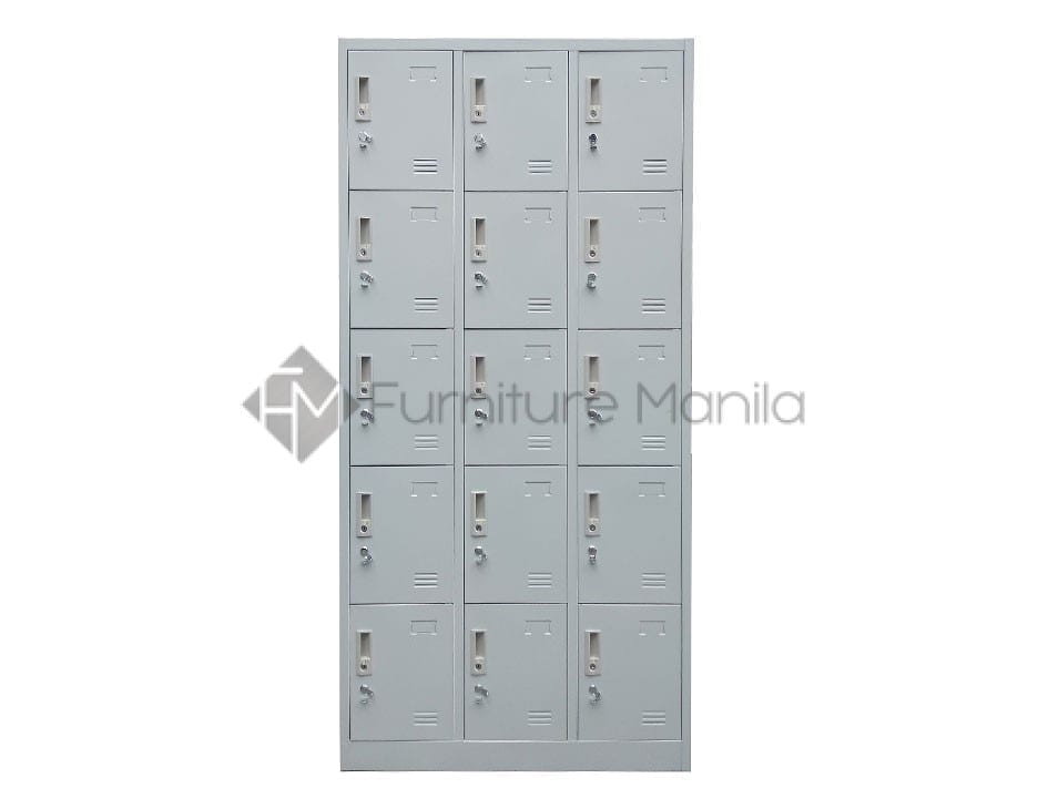 - Material: Metal, Powder-coated in light gray finish, with hasp provision for padlock and built-in locking mechanism