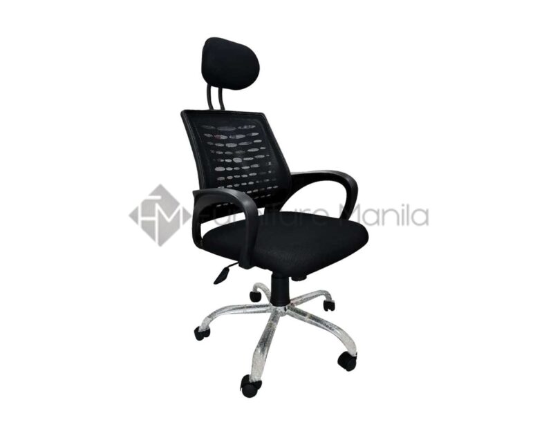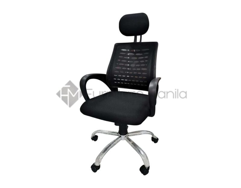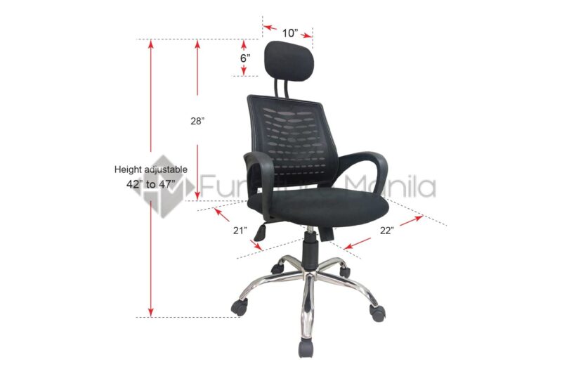 Office chair with headrest and armrest, adjustable gaslift, mesh black back and fabric seat, and chrome finish starbase with castor wheels. 3 months warranty on parts. Made in China.