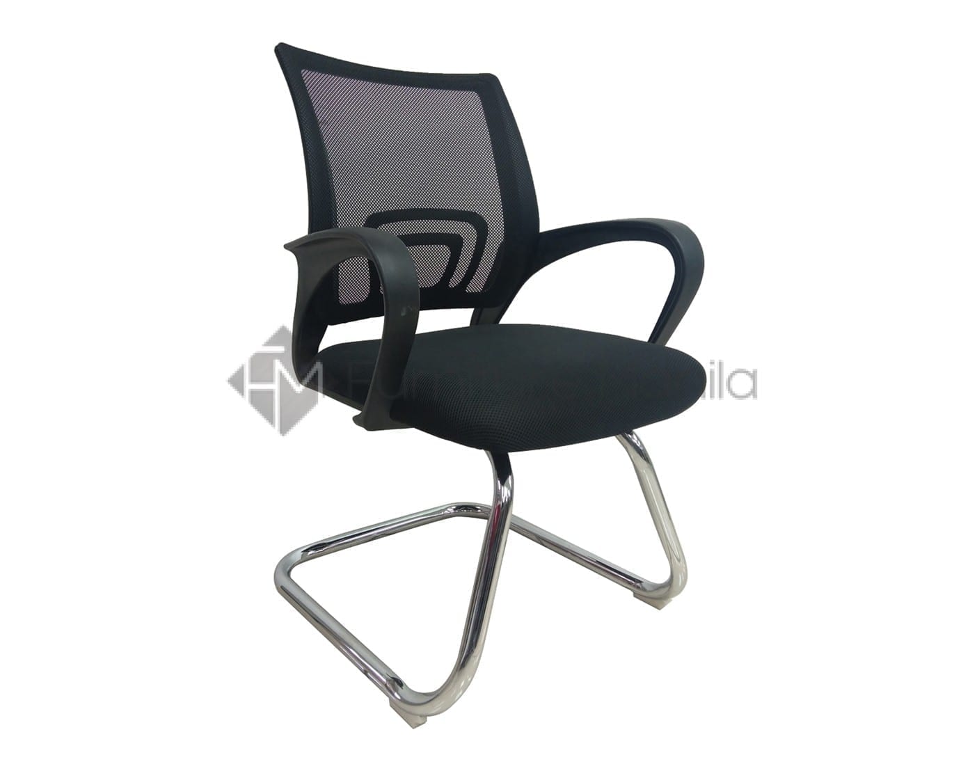 Visitors chair with armrest, adjustable gaslift, mesh black back and fabric seat, and sled-type chrome base.