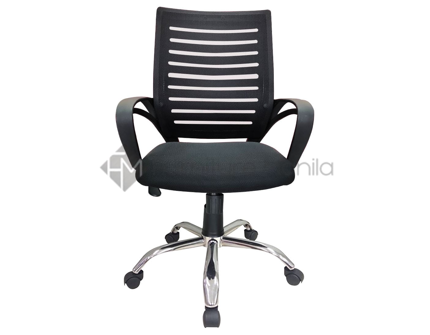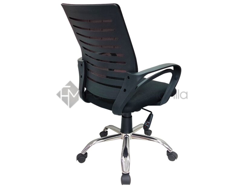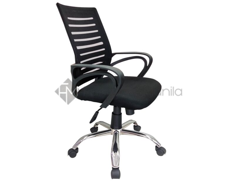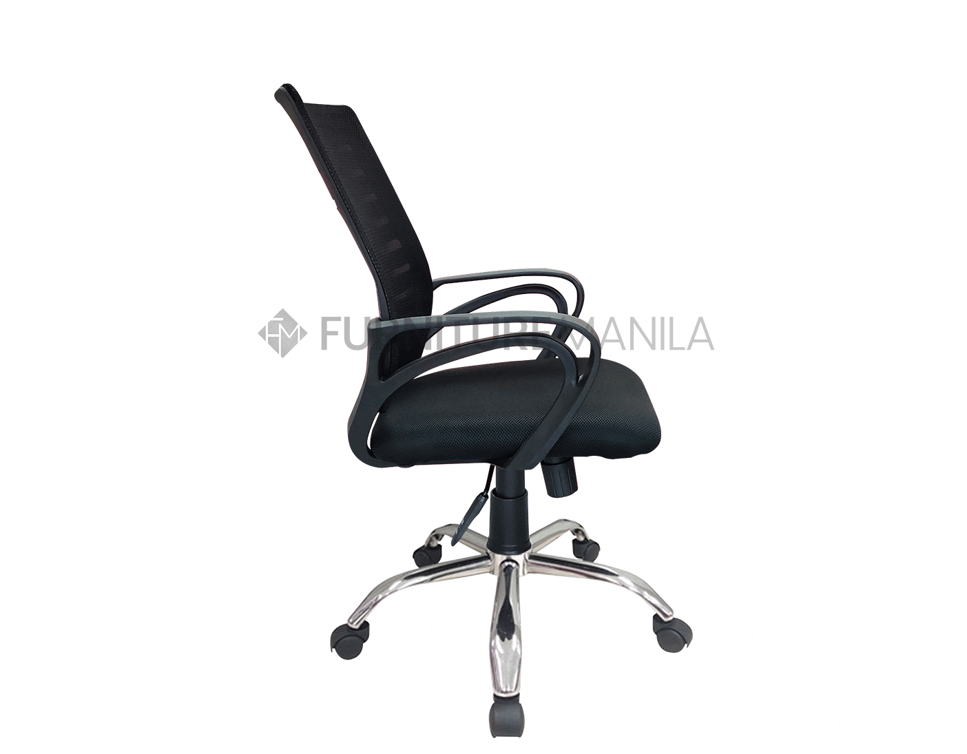 Office chair with armrest, adjustable gaslift, mesh back and fabric seat, and chrome finish starbase with castor wheels. Made in China.