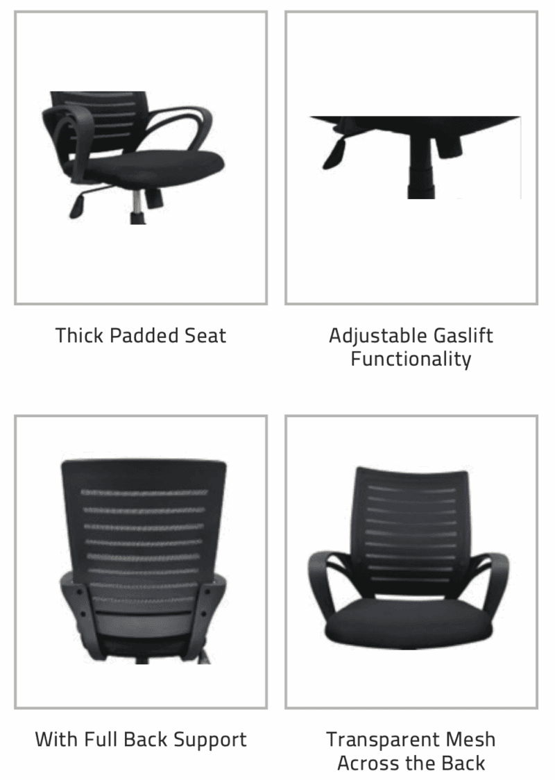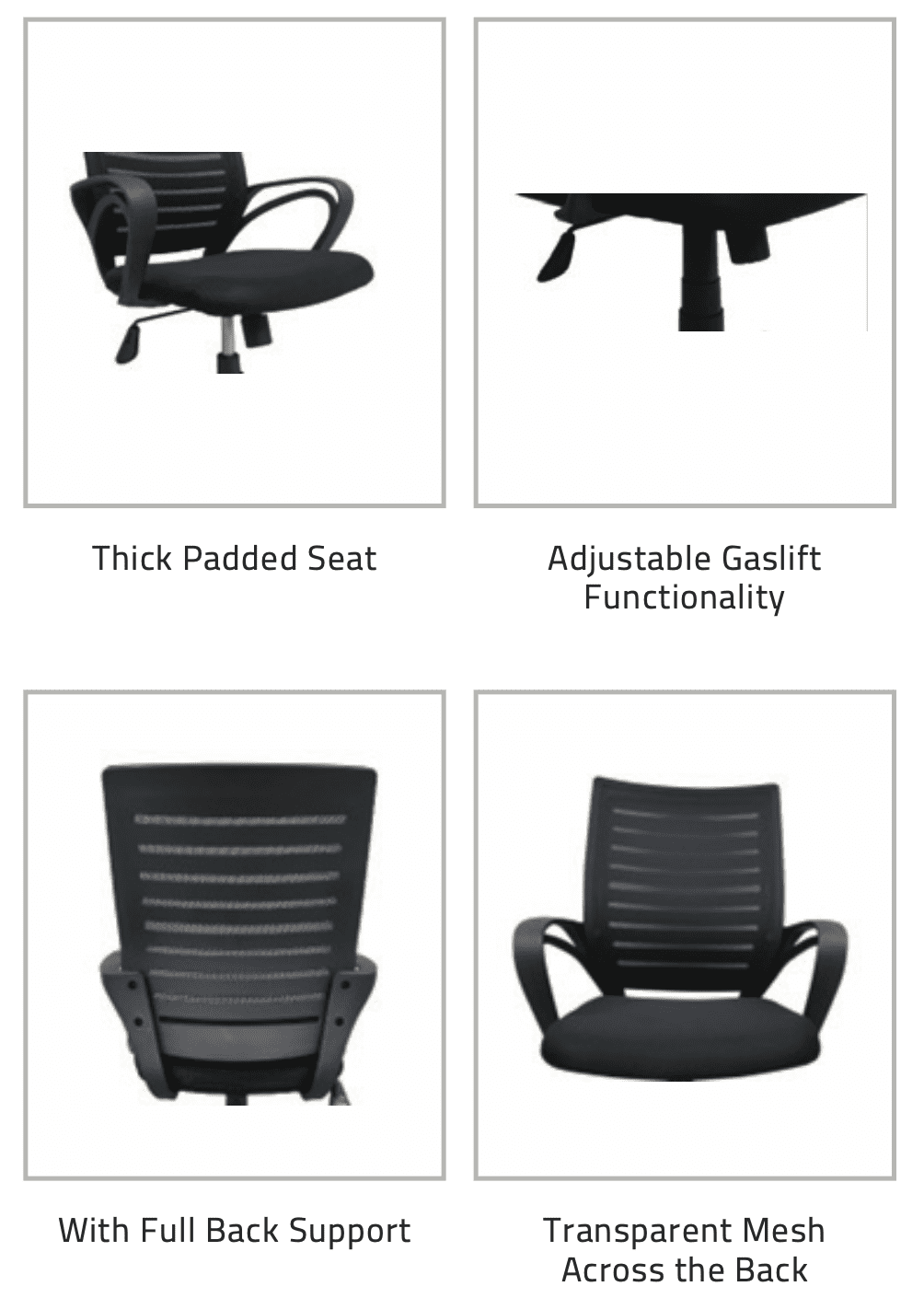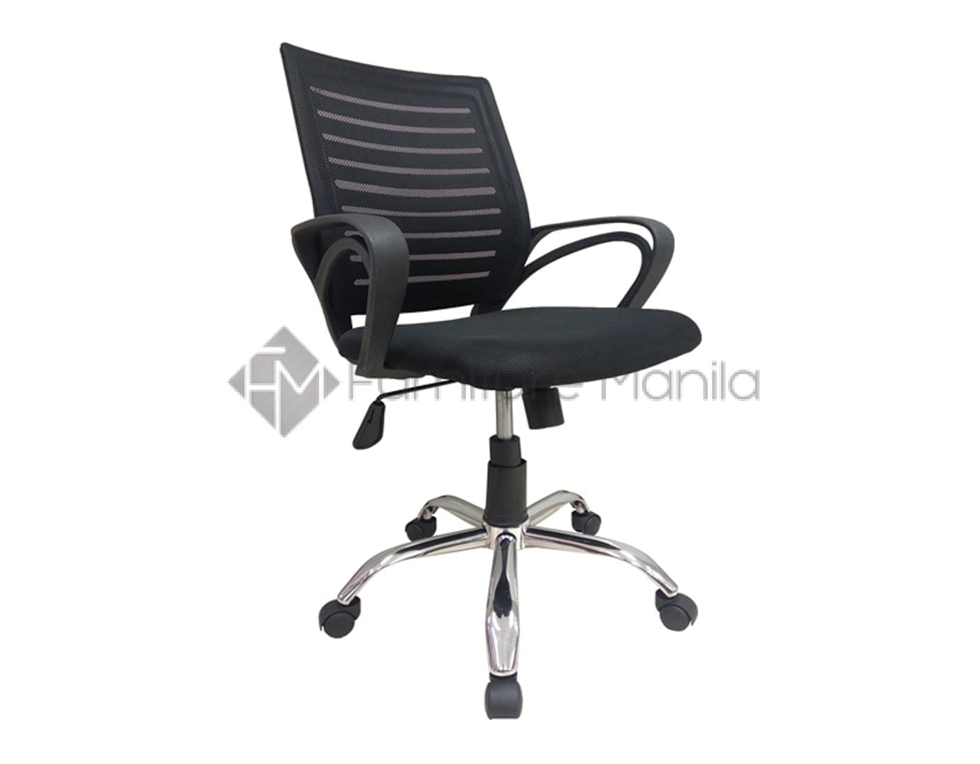 Office chair with armrest, adjustable gaslift, mesh back and fabric seat, and chrome finish starbase with castor wheels. Made in China.
