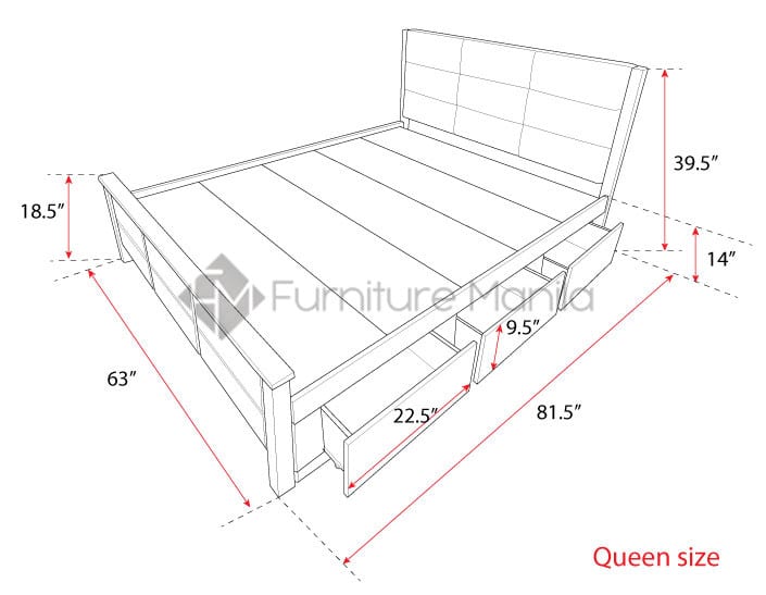 - Queen: L81.5″ x W63″ x H39.5″ Footboard H18.5″