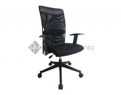 - Highback swivel chair with adjustable armrest and gaslift, lumbar back support, fabric seat with mesh backrest, and nylon starbase and castor wheels.