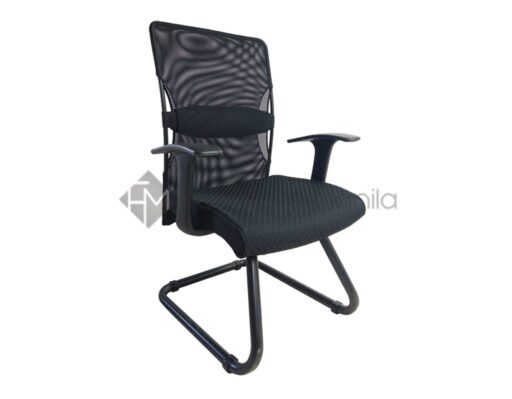 Visitors midback swivel chair with adjustable armrest and gaslift, lumbar back support, fabric seat with mesh backrest, and sled-type base.