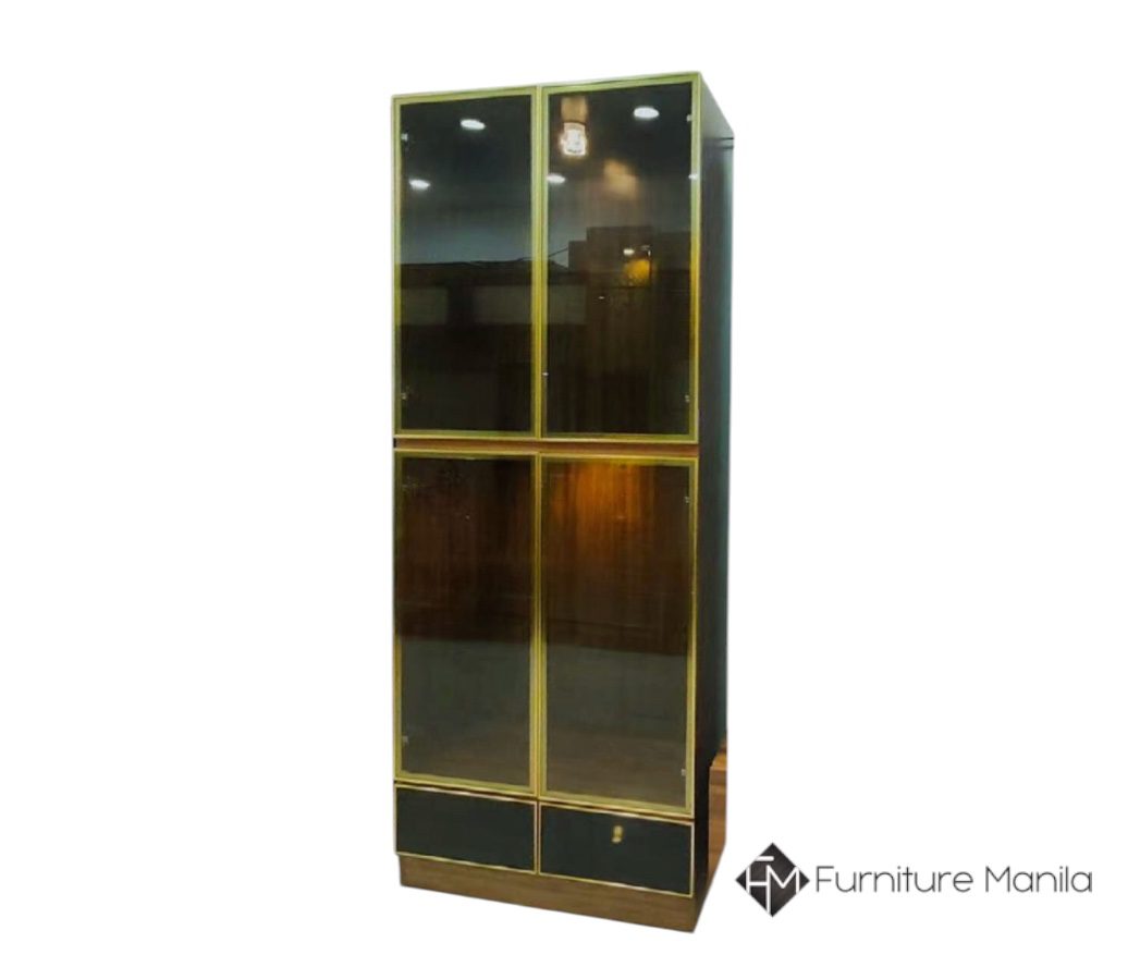 The Jian Display Cabinet is a refined storage solution designed to showcase your treasured items in style. Crafted in a rich brown finish and accented with gold-tone trim, this tall cabinet features four glass doors that protect your display pieces while allowing them to be admired.