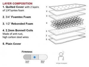 - 2.2 MM Bonnell coils made of anti-rust, high carbon steel wires.