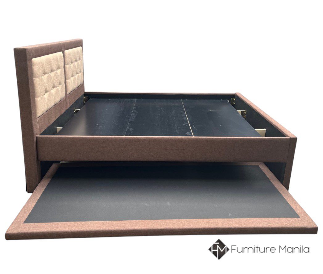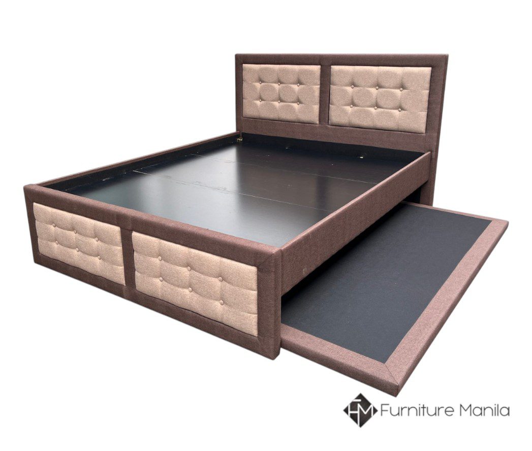 The Marina Bed Frame combines style and function with its soft fabric upholstery, tufted panels, and a convenient pull-out bed for extra sleeping space.