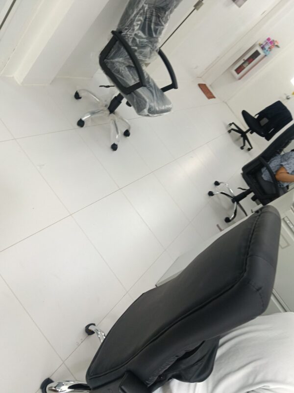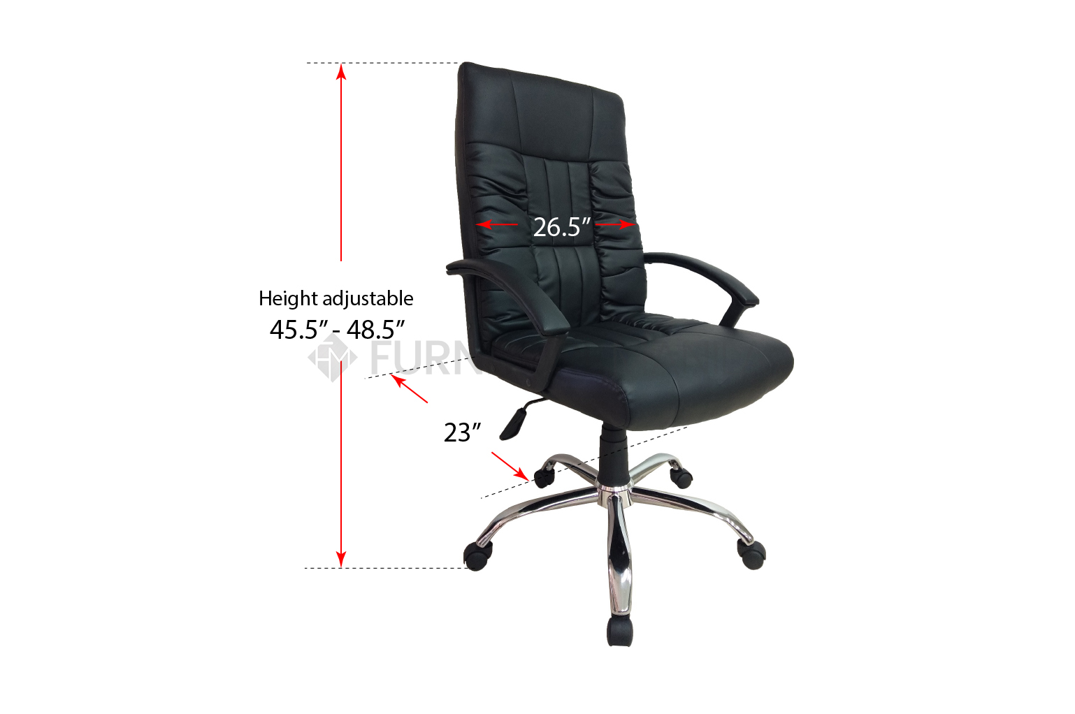 Highback chair with armrest, adjustable gaslift, PU Black back and seat, and chrome starbase with castors wheels. 6 months warranty on parts.