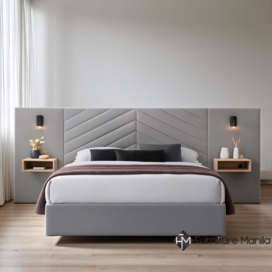 Elegant diagonal panels draw the eye and provide cushioned support for lounging or reading in bed.