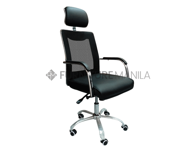 Executive Chair with armrest, adjustable gaslift and headrest, PVC-mesh back and fabric seat rest, and chrome starbase with castor wheels. 6 months warranty on parts.