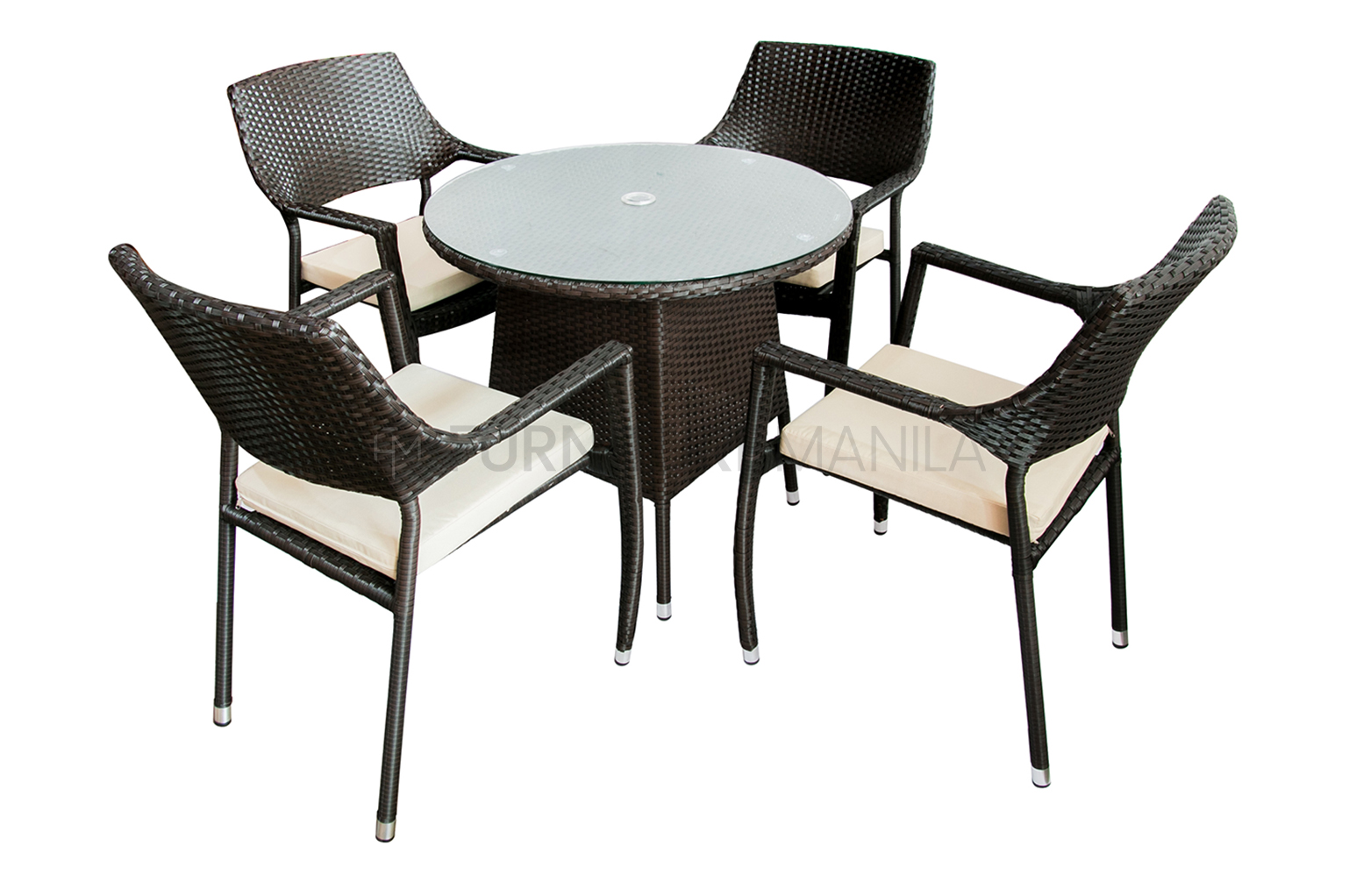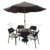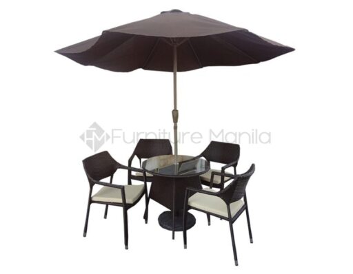 - Description: An outdoor dining set with a 4 wicker arm chair with or without umbrella