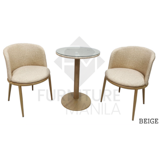 Bring comfort and elegance to your space with the Seed Lounge Set. This 3-piece set includes two cushioned fabric chairs with a curved backrest and a sleek round table with a metal frame and wood-finish base. The neutral beige color easily complements any interior style, making it ideal for living rooms, waiting areas, or breakfast nooks.