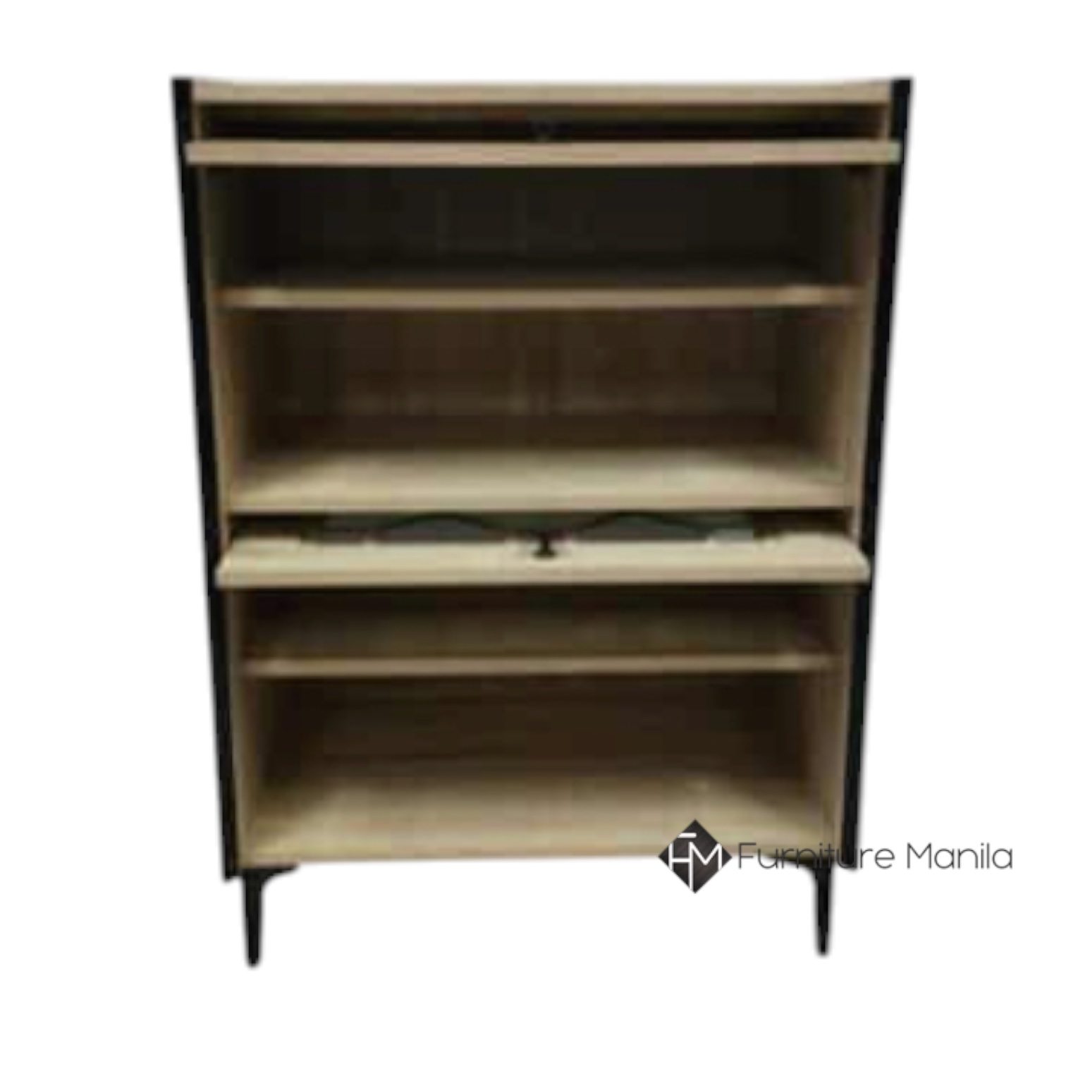 - Flip-down doors reveal tiered shelves for quick grab and go organization.