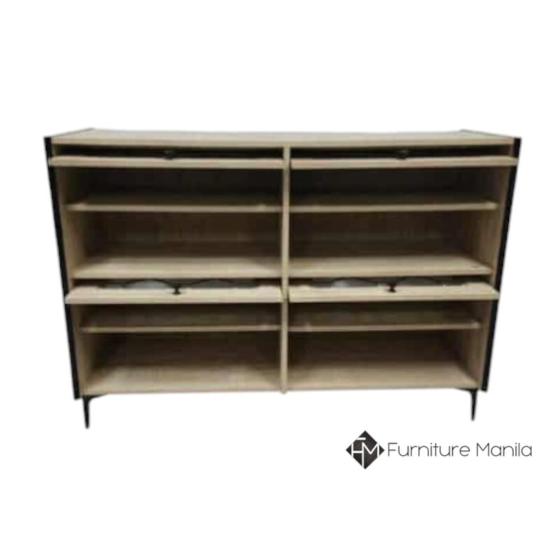- Spacious interior shelving arranged in two columns to sort shoes by owner or type.