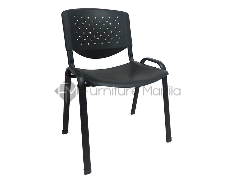 Visitor’s Chair without armrest, black plastic-mesh back and seat, and four-legged black coated metal leg.