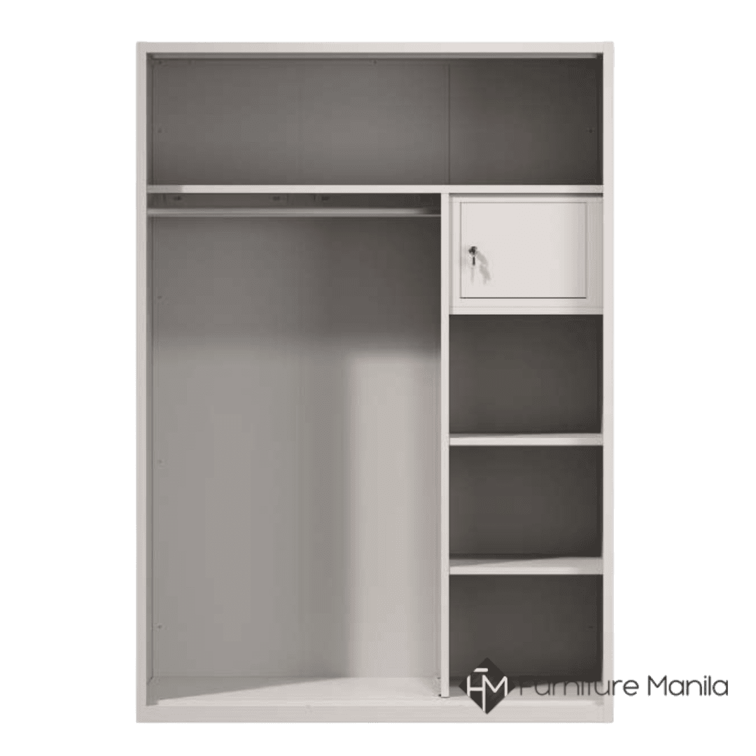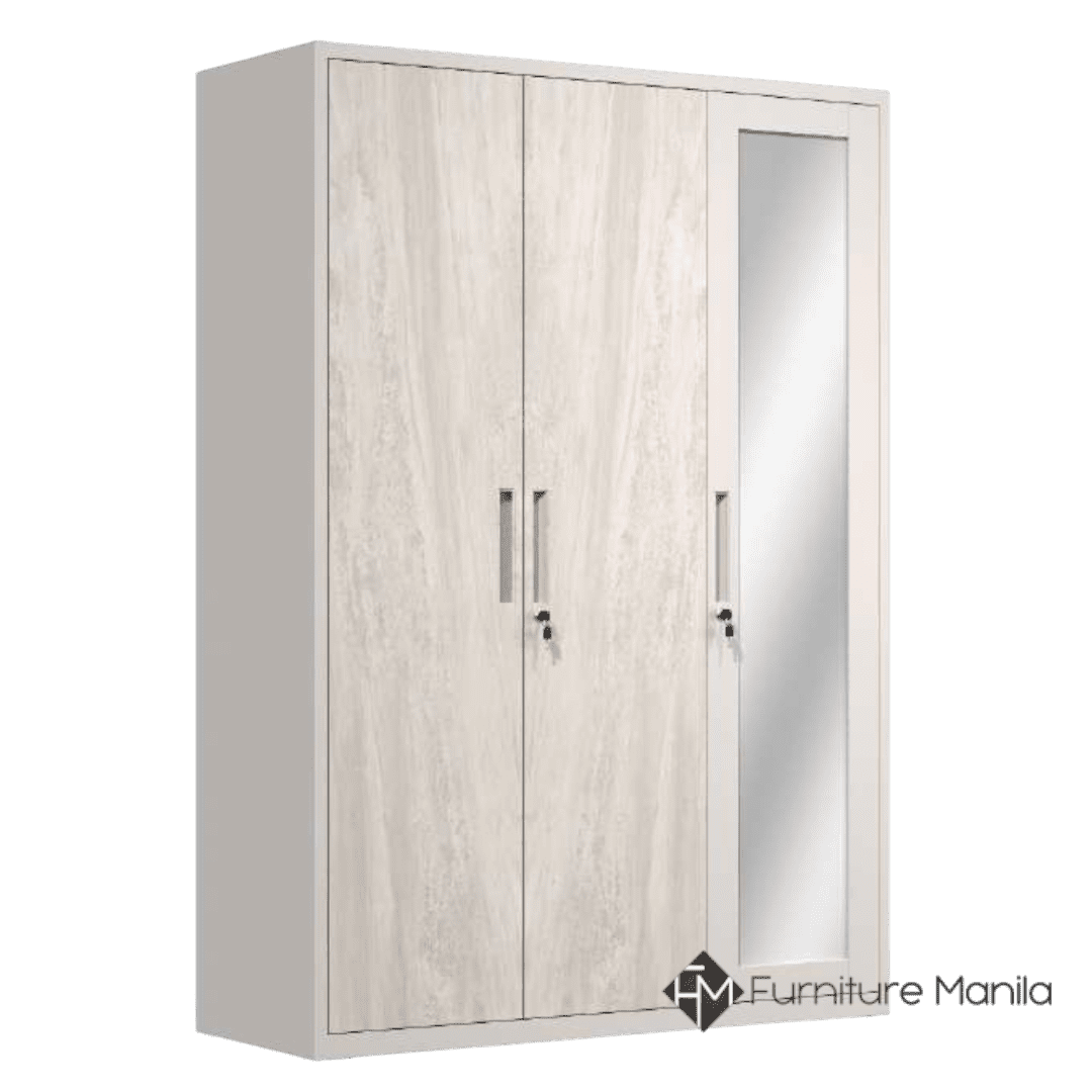 - Features: 3 doors, full-length mirror, shelves, hanging space, lockable compartment