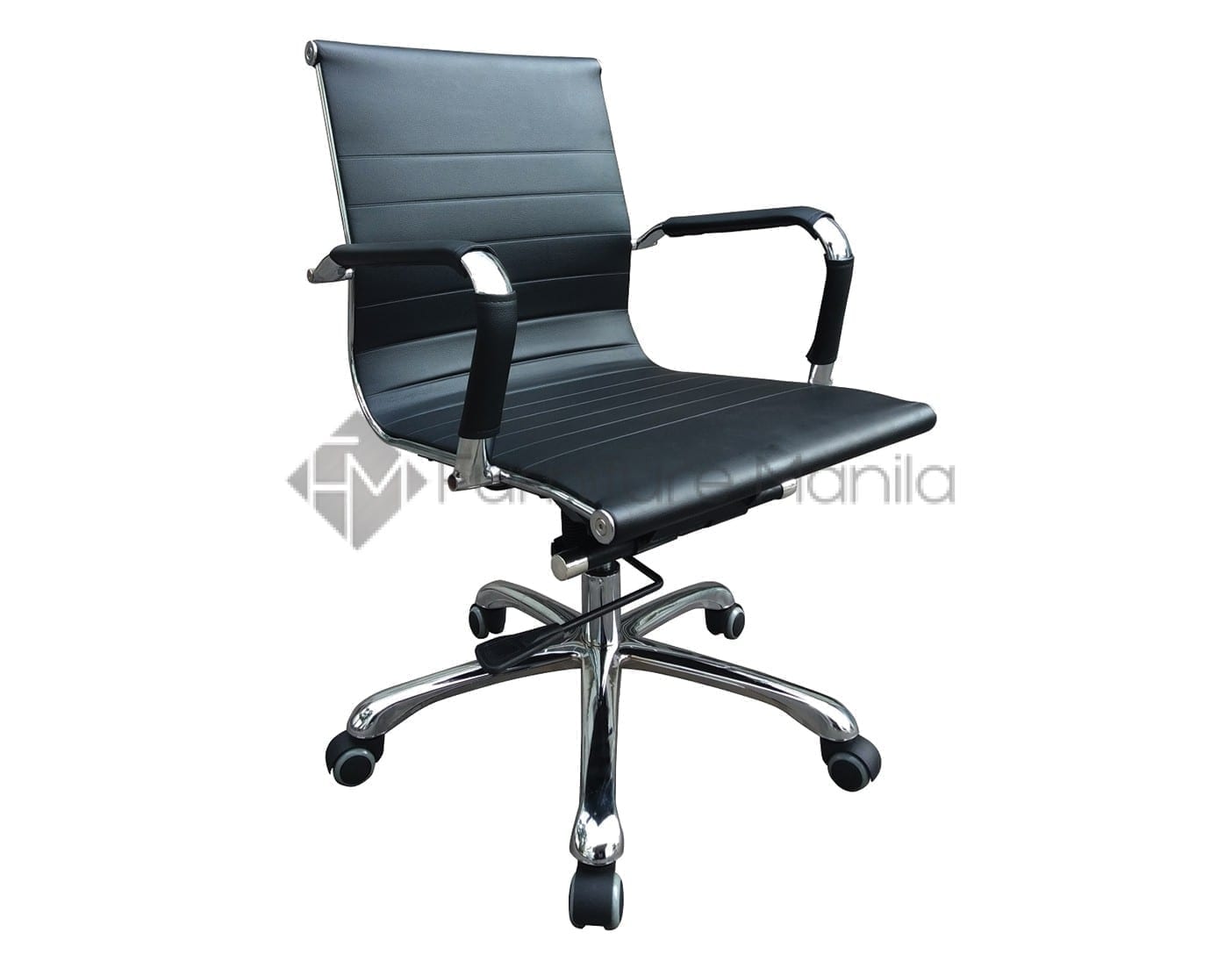 Executive Midback Chair with armrest, adjustable gaslift with tilting mechanism, soft-thread black leather upholstery, and chrome finish starbase with castor wheels.