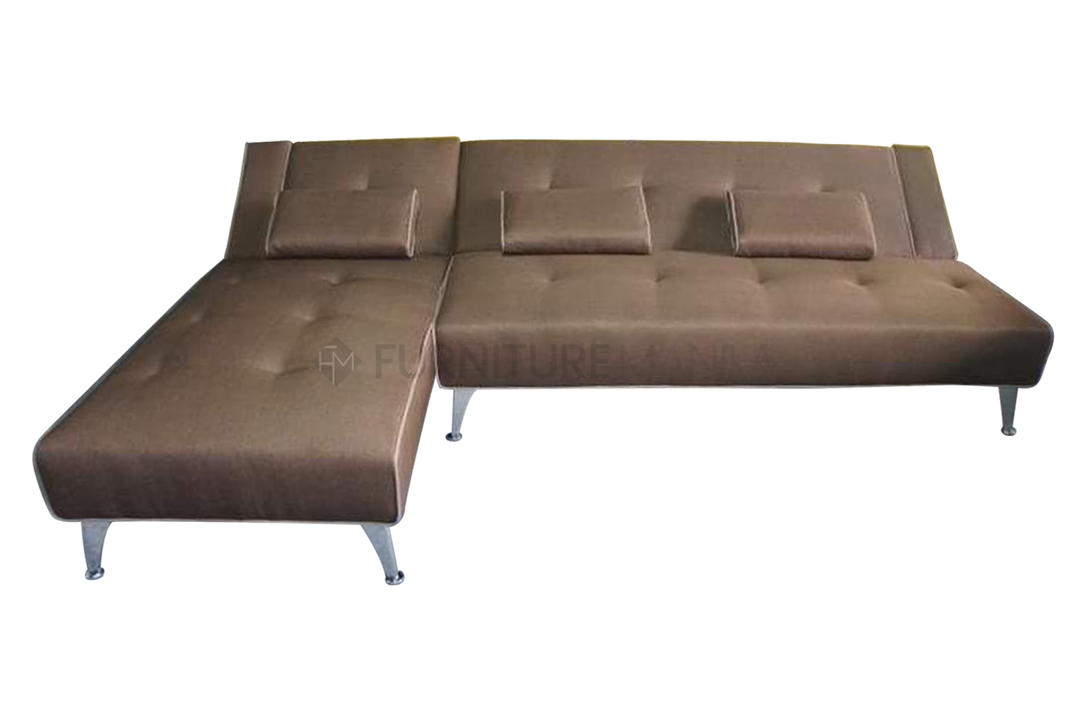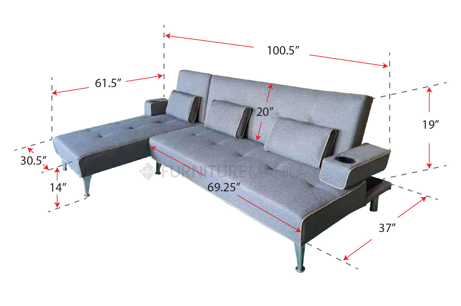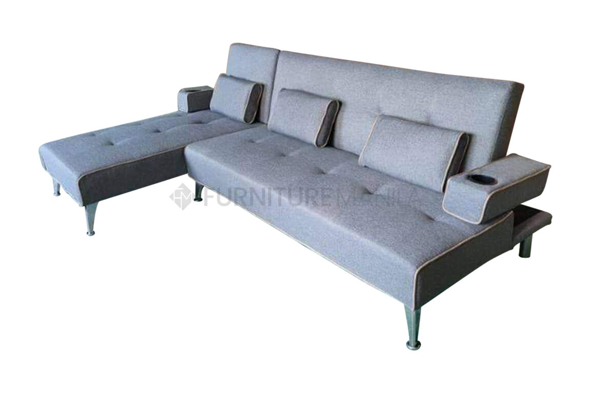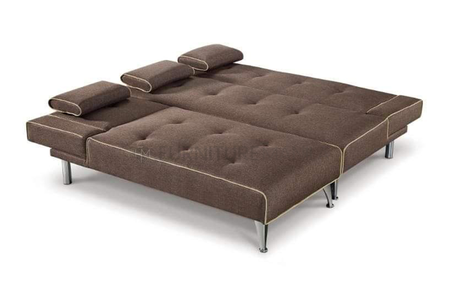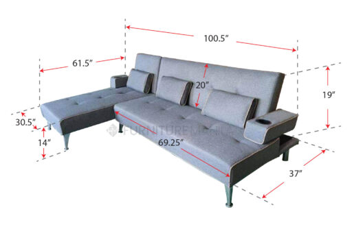 Space-smart sofa bed with a chaise lounge and cupholder armrest. Soft fabric upholstery, modern metal legs and three matching pillows. Converts from comfy sofa to flat sleeping surface in seconds.